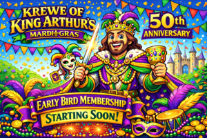 King Arthur membership for our 50th Anniversary Parade is now open to 2026 returning members โ and opens to everyone on March 4! As in past years, weโre offering our Early Bird dues of $450. After that, dues will increase to $650. These remain among the lowest dues in all of Mardi Gras, making it…